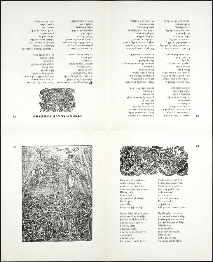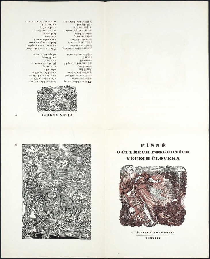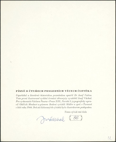 (Váchal). "Písně o čtyřech posledních věcech člověka". Praha: Pour, 1944. Přednostní výtisk čís. 86/200 s Váchalovým podpisem v tiráži. Větší 8°. 39, (1) str. 14 dřevoryty vyzdobil J. Váchal. Uspořdal Dr. J. Vašica. Volné archy v původní ilustrované obálce.