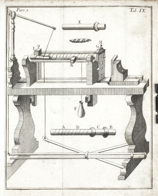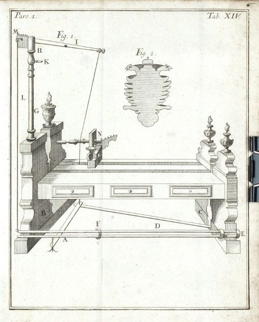 Teuber, Johann Martin. "Vollständiger Unterricht Von Der gemeinen und höhern Dreh-Kunst". Regensburg und Wien: Bader, 1756. 8vo. Gest. Frontispiz, (20), 211 S., 30 (I-XIV und I-XVI) gefaltete Kupfertafeln. Orig. Ledereinband aus der Zeit mit Rückentitelschild und -vergoldung.
