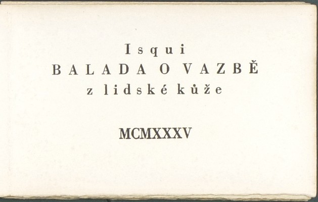 (Novák, Viktor; pseud. Isqui; 1890-1959). "Balada o vazbě z lidské kůže". Soukromý tisk. (Praha: Bradáč), 1935. Výtisk čís. 2/16 na ručním papíře. 16° na šířku (8x13 cm). (32) str. Volné dvoulisty v papírové obálce.