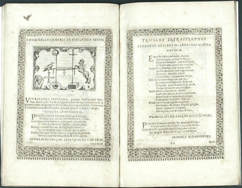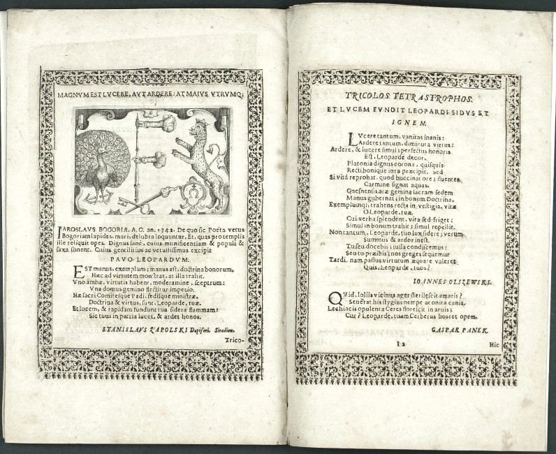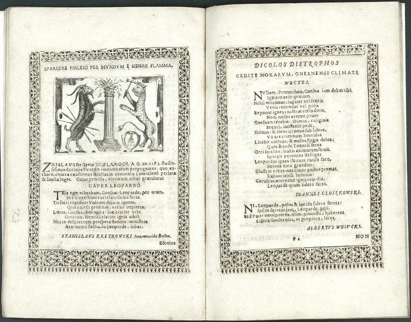 (Emblemata). Firlej, Henryk (1574-1626; addressee of the dedication); Johannes Dobrzycki and other authors. "Leopardus Illustrissimi Ac Reverendissimi Domini D. Henrici Firley Archiepiscopi Gnesnensis ...". (Kalisz): Wojciech Gedeliusz, 1624. Small folio. (25 instead of 33) sheets with 2 engraved coats of arms and 9 emblematic engravings with heraldic figures.