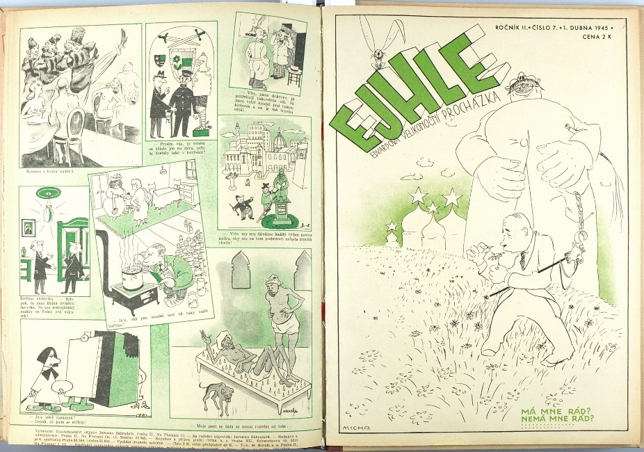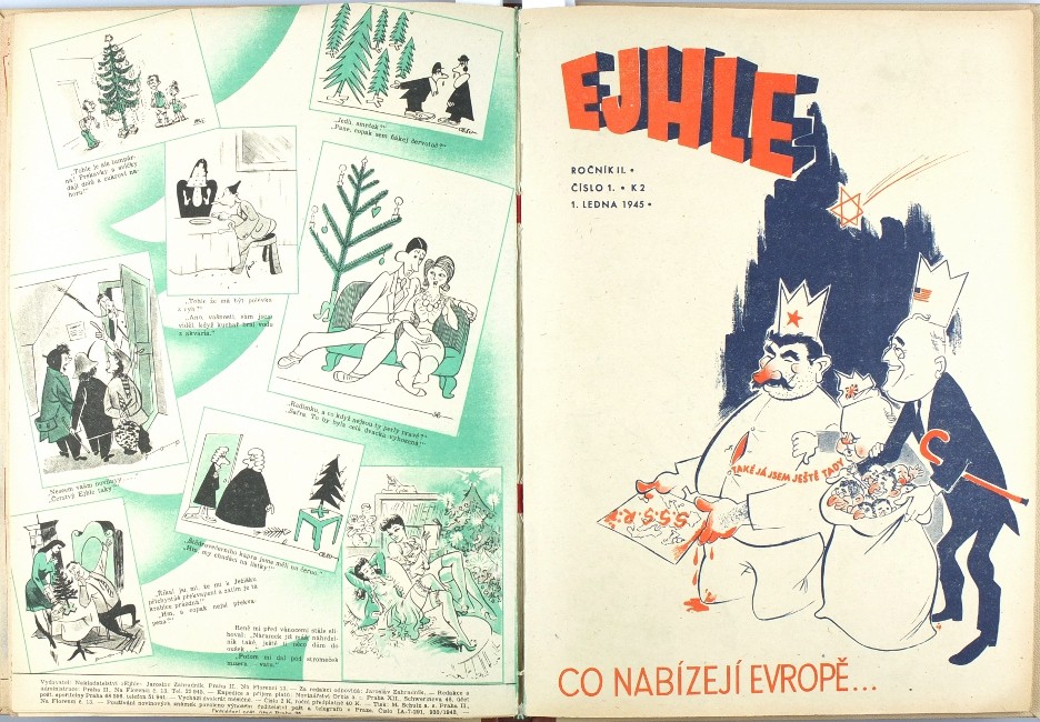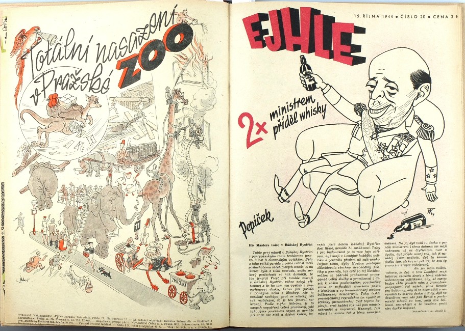 "Ehjle". 10 čísel 1944 (15-24), 8 čísel 1945 (1-8 - číslo 8 z 15. 4. 1945) - 18 čísel v jednom svazku. (144) str - každé čís. 8 str. Praha: Nakladatelství "Ejhle", Jaroslav Zahradník (pseudonym), 1944-45. Fol. (34,5:25 cm). Celopl. vazba druhé pol. 20. stol.