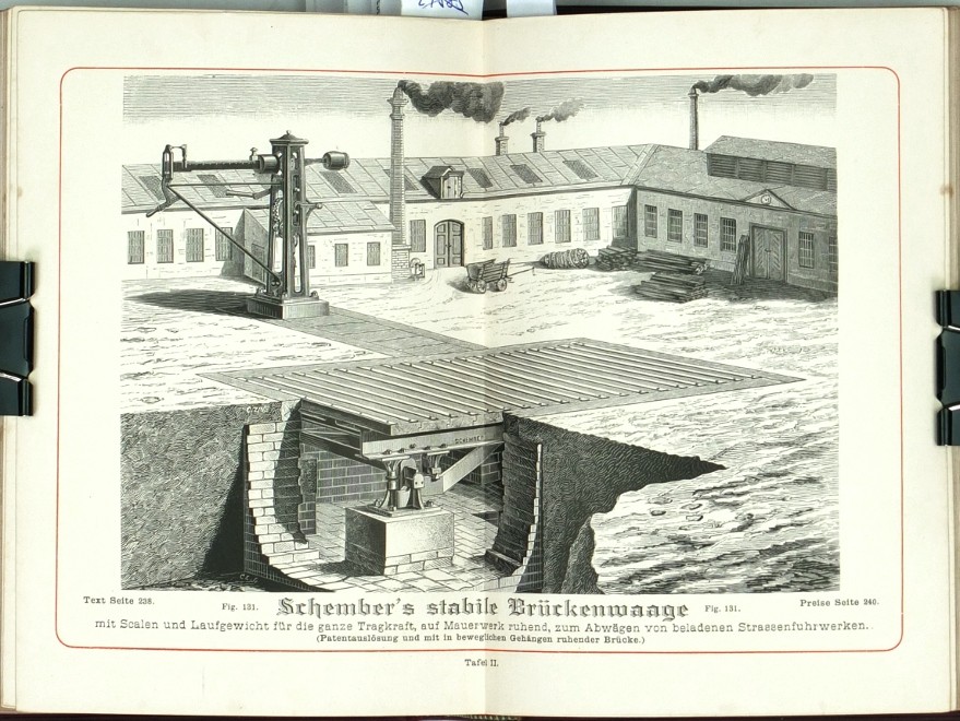 Weighing scales and equipment - a catalogue. "K. k. priv. Brückenwaagen- und Maschinen-Fabriken C. Schember & Söhne". Wien, um 1890. Gedruck von F. Jasper. 8vo. (23) Bll., 287, (1) S. mit zahlreichen xylographischen Abbildungen (oft ganzseitigen) im Text, XI zweiseitigen Tafeln. Luxuriöser geprägter Vollledereinband mit reicher Vergoldung.