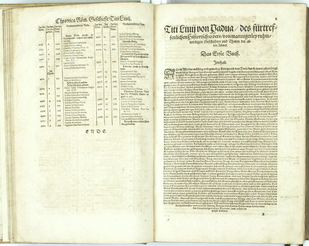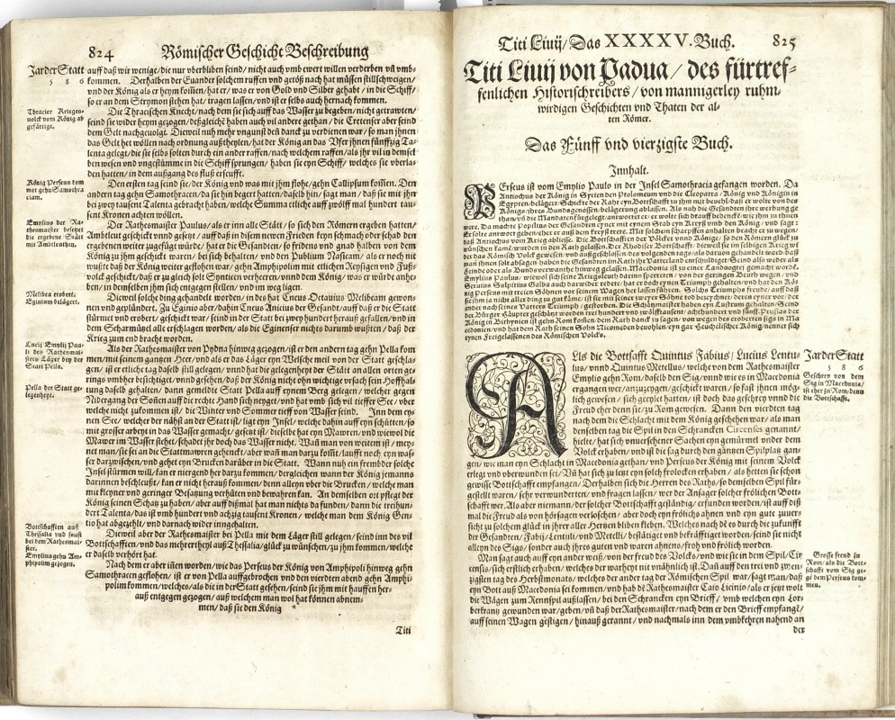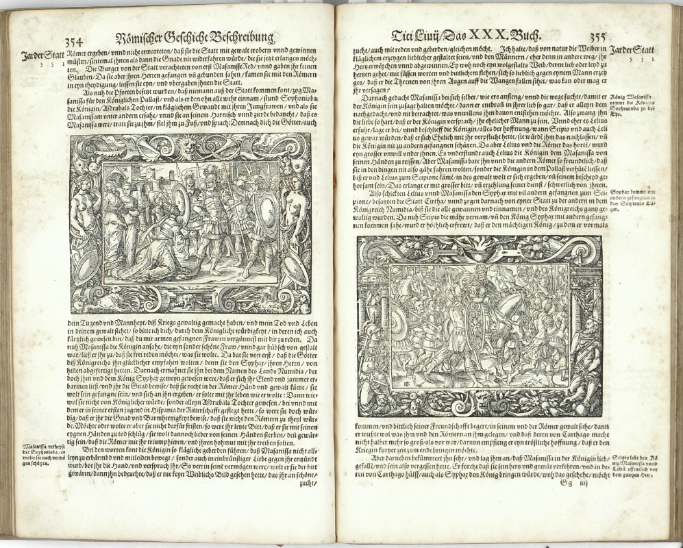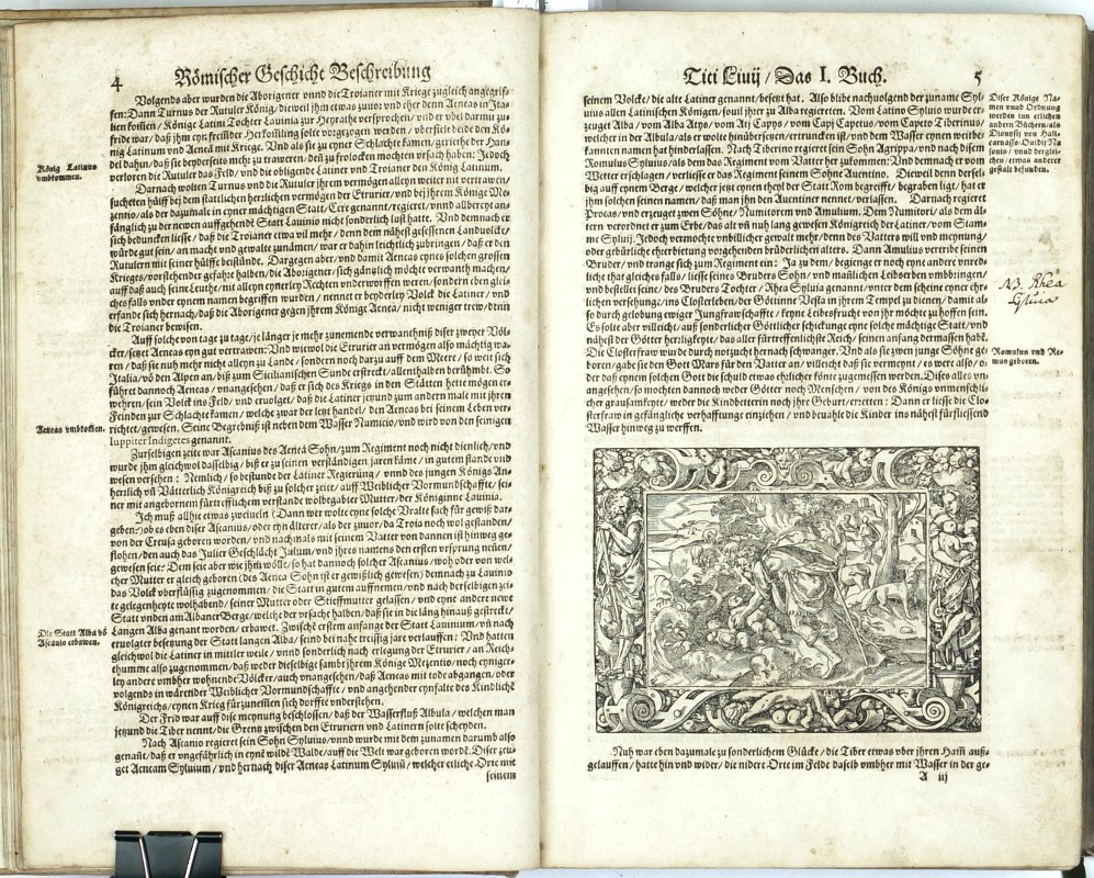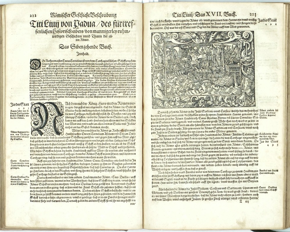 Titus Livius and Lucius Annaeus Florus. "Von Ankunfft unnd Ursprung des Römischen Reichs ... biß auff der ersten Römischen Keyser Regierung, verloffen und zugetragen. Jetzund auff das newe auß dem Latein verteutscht". (Strasbourg: Th. Rihel, 1581). Folio. Titel in woodblock border, (26), 887, (20) pp. With 131 woodblocks (by Jost Amman and Tobias Stimmer) in the text. Full-parchment binding from the time.