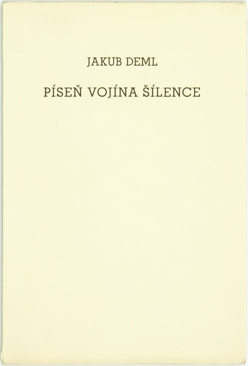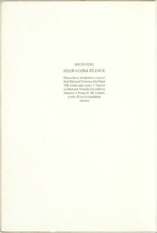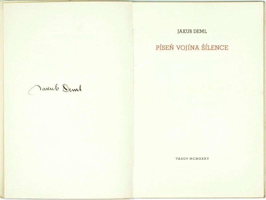 Deml, Jakub. "Píseň vojína šílence". Tasov: nákladem autora, 1935. Větší 4°. 60 str., (2) ll.. Proti titulu podpis autora perem. OBrož.
