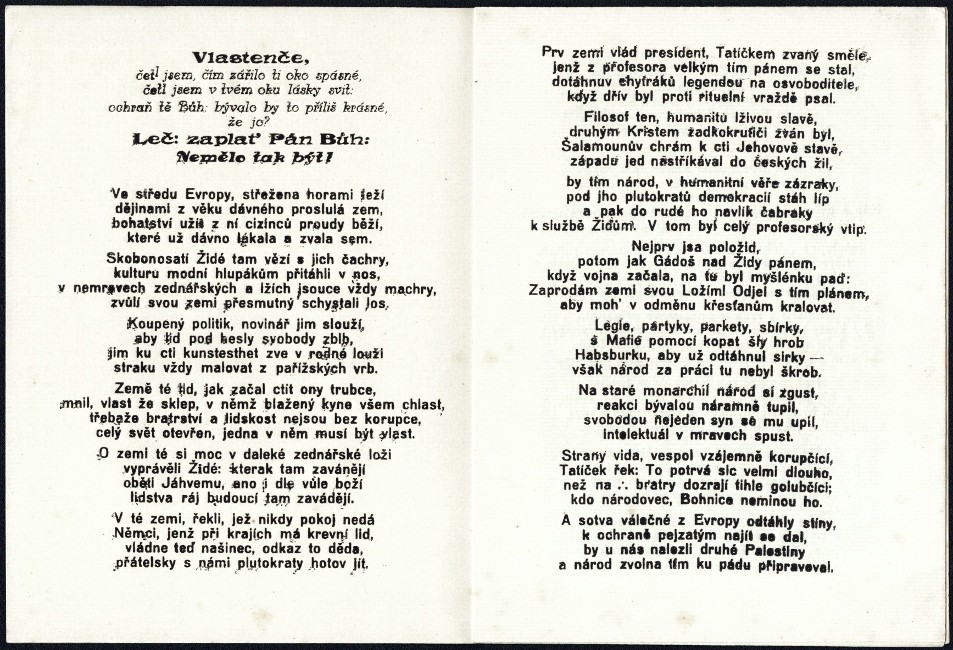 Váchal, Josef. (anonymně) "O té nebožce zpěvy patery. Rýmování první: ČSR. Rýmování druhé: Bývalo by to příliš krásné ...". (Studeňany): Tiskem M. Chocholky roku tohoto (t. j. nákladem vlastním, 1939-45). 8° (20:14,5 cm). (10), (6) ll. s celkem 9 původními dřevoryty (4 z toho celostránkové). Vlastní Váchalovo písmo a tisk na ruční papír. 2 sešity - volné dvoulisty.