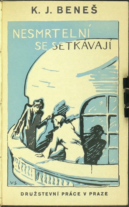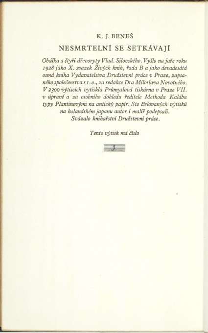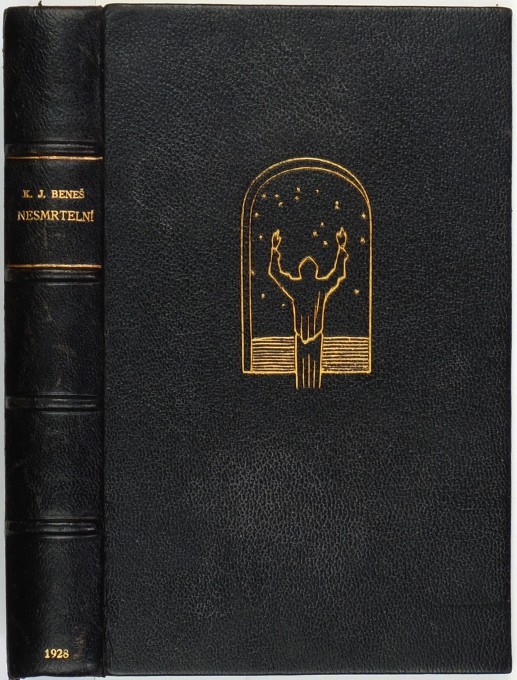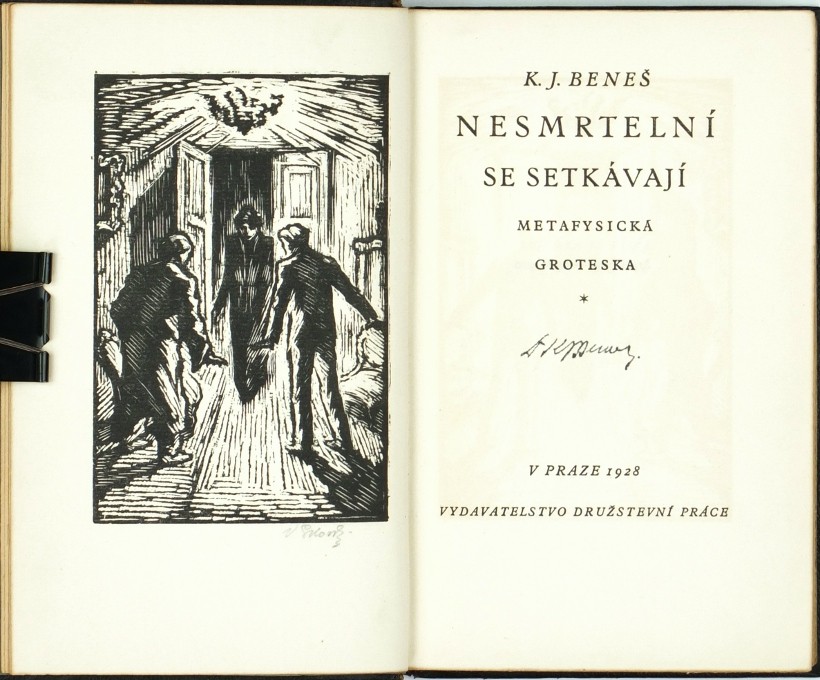 (Vladimír Silovský). Beneš, Karel Josef. "Nesmrtelní se setkávají". Praha: Družstevní práce, 1928. Ed. 'Živé knihy', sv. X. Přednostní výtisk čís. 3/100 na holandském japanu (celkový náklad byl 2300 výtisků). 8°. 215, (7) str. se 4 původními dřevoryty V. Silovského (první tužkou signovaný). Na titulu podpis autora perem. Původní ilustrovaná obálka (také Silovský) vevázána. Nakladatelská celokožená vazba se zlacenou ražbou na předních deskách a na hřbetu a zlacenou horní ořízkou.