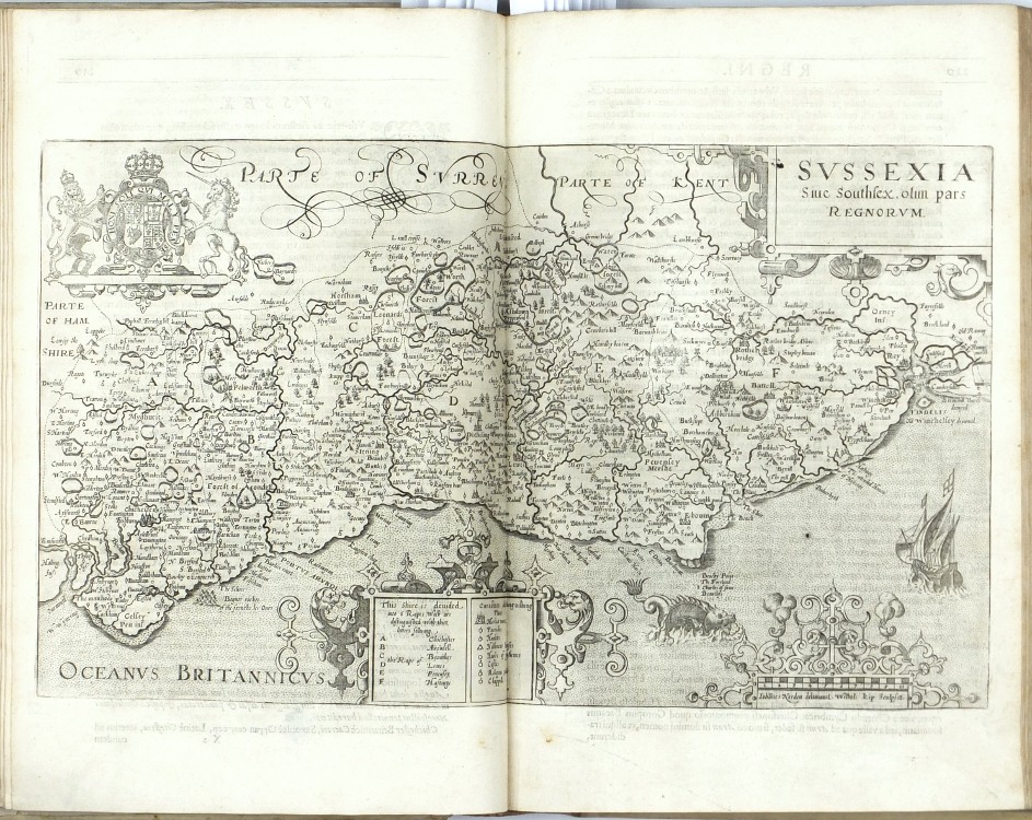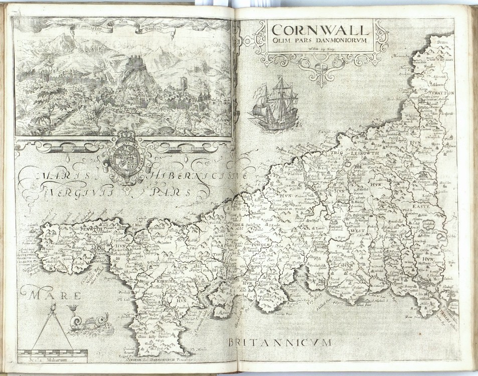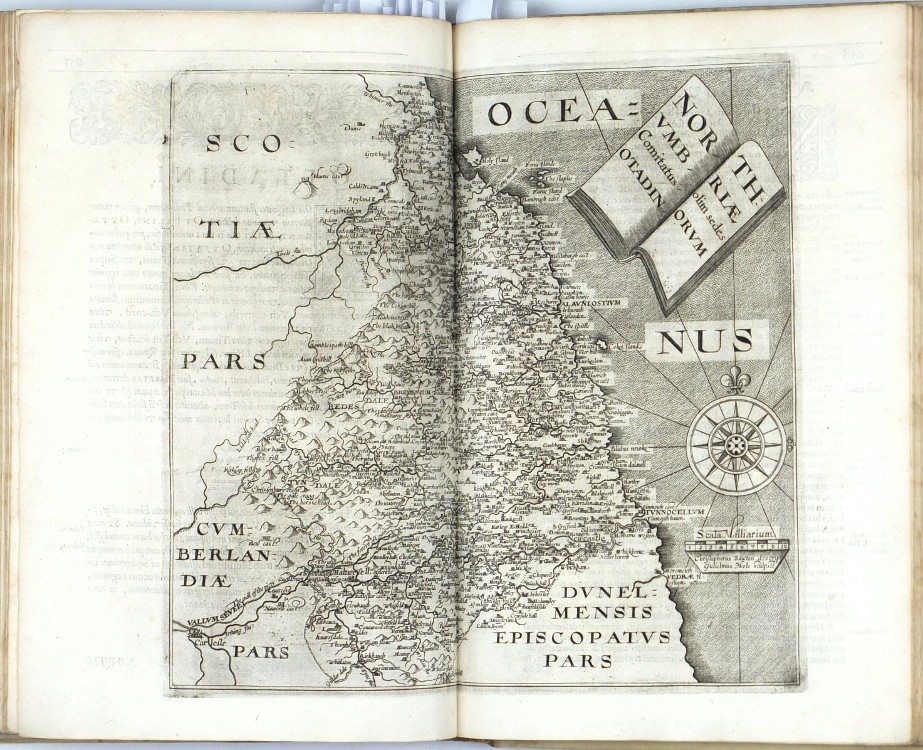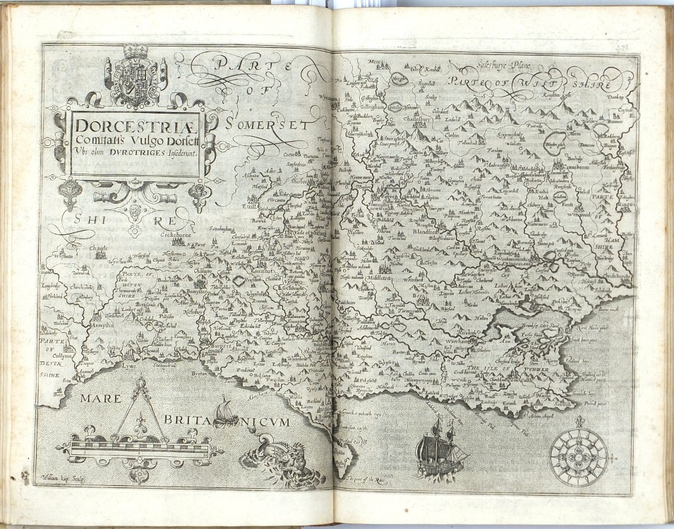 Sixth Latin edition of the great Elizabethan topographical and historical survey of Britain, the last published in Camden's lifetime, and the first to contain the county maps (54 are double-page, 3 are single-page). These were mainly engraved by William Hole (21) or William Kip (34), after the maps of Christopher Saxton (41) or John Norden (6). George Owen contributed Penbrokeshire. The other county maps are unsigned, the general maps of England, Scotland, and Ireland are derived from Mercator. - Map of 'Cambridge' (pp. 354-355) with a brown stain, otherwise very well preserved.