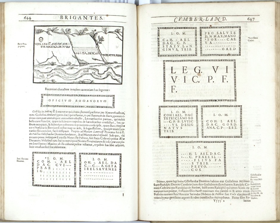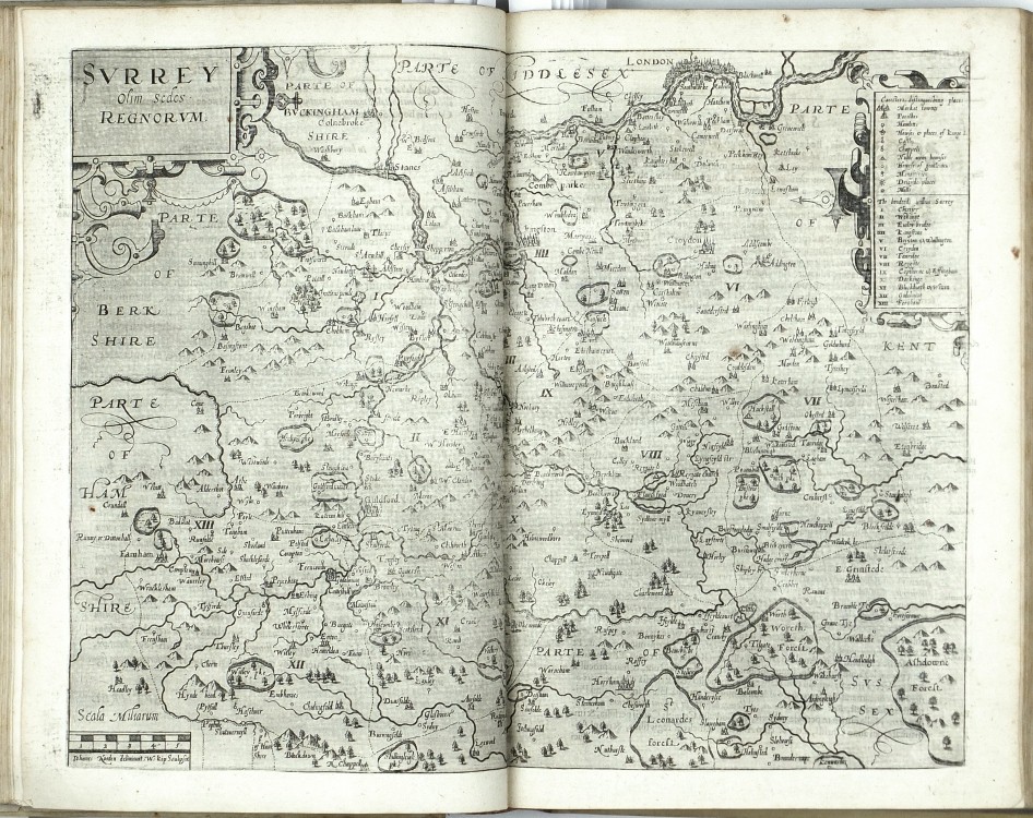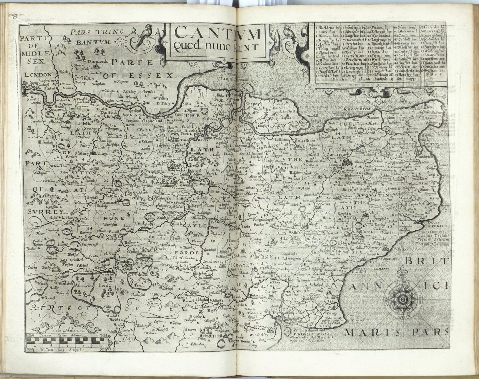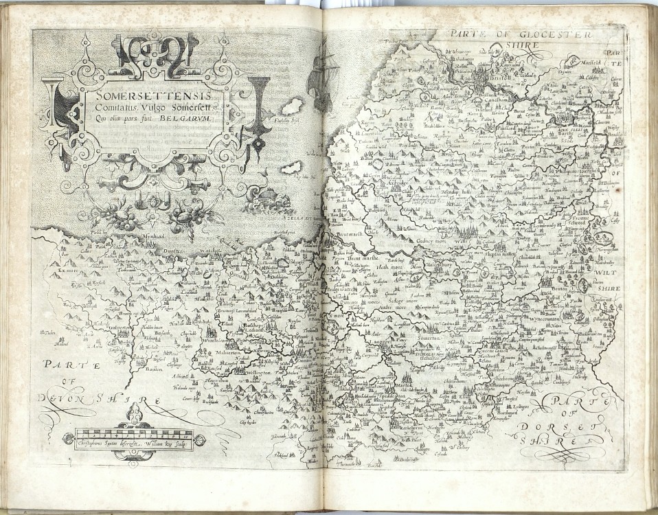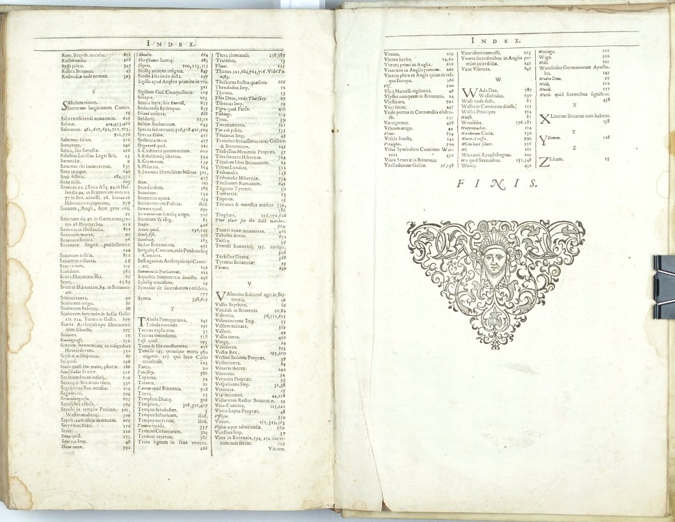 Sixth Latin edition of the great Elizabethan topographical and historical survey of Britain, the last published in Camden's lifetime, and the first to contain the county maps (54 are double-page, 3 are single-page). These were mainly engraved by William Hole (21) or William Kip (34), after the maps of Christopher Saxton (41) or John Norden (6). George Owen contributed Penbrokeshire. The other county maps are unsigned, the general maps of England, Scotland, and Ireland are derived from Mercator. - Map of 'Cambridge' (pp. 354-355) with a brown stain, otherwise very well preserved.