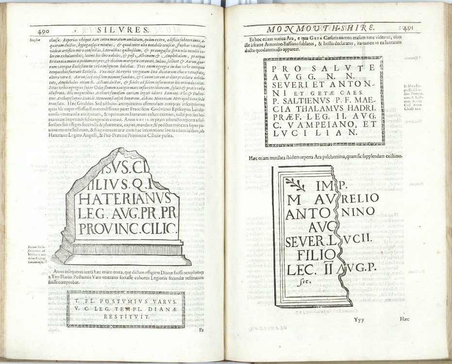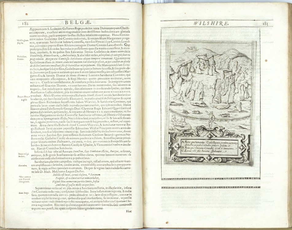 Camden, William. Britannia. First edition with county maps. "Britannia, sive Florentissimorum regnorum Angliae, Scotiae, Hiberniae et Insularum adjacentium ex intima antiquitate chorographica Descriptio: Nunc postremo recognita, plurimis locis magna acessione adauct, & Chartis chorographicis illustrata ...". London: George Bishop and John Norton, 1607. Folio. (16), 860, (24) pp. (with the usual irregularities in pagination) with full-page engraved title / frontispiece ('Britannia' - map of Great Britain in allegorical border), 57 engraved maps, 8 full-page engraved illustrations of coins (pp. 62-69), full-page engraving of Stonehenge (p. 183) and many woodcuts in the text (Roman inscriptions, the Rollright Stones, etc.). Full parchment binding from the time.