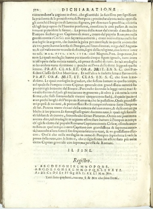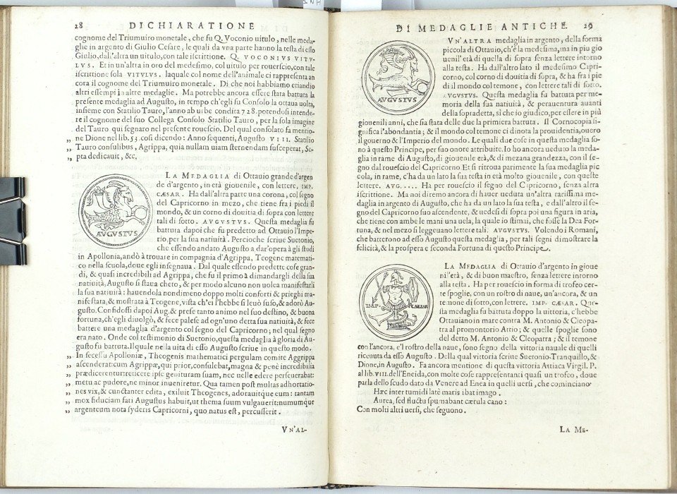 Erizzo, Sebastiano. Roman coins and medals, numismatics. "Discorso Di M. Sebastiano Erizzo Sopra le Medaglie de gli Antichi. Con la Dichiaratione delle Monete Consulari, & delle Medaglie de gli Imperadori Romani. Nella qual si contiene vna piena et varia cognitione del'istoria di quei tempi. Di nuouo in questa quarta Editione dall'istesso Authore reuisto, & ampliato". Venice: Varisco and Paganini, (1584). 8vo. (16), 282, 572 pp. with woodcut-title and many wodcuts (coins and medals) in the text. Full parchment binding from the time with aristocratic supralibros on front and back boards.
