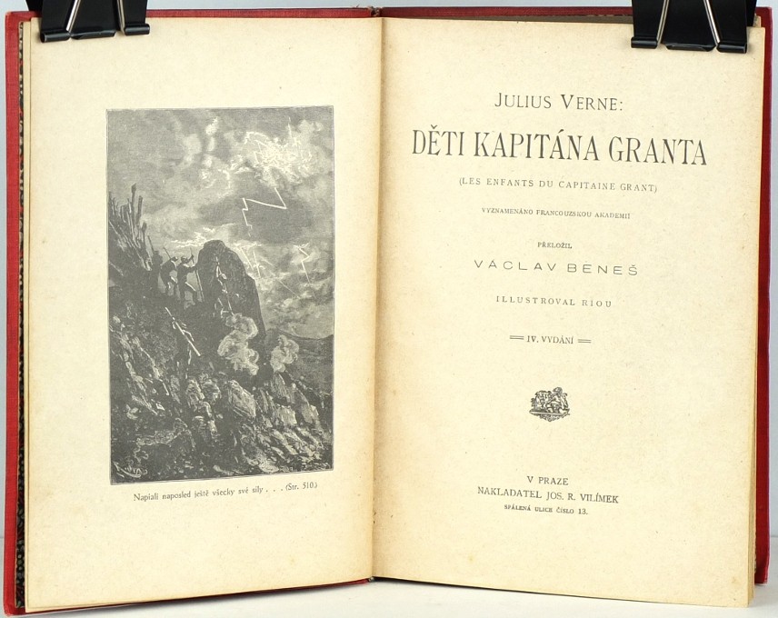 Verne, Jules. "Děti kapitána Granta". Praha: Vilímek, 1934. IV. vydání. Z fr. orig. (Les enfants du capitaine Grant) přel. V. Beneš. 8°. 564 str. s množstvím celostr. il. E. Riou. Orig. nakladatelská celoplátěná tlačená vazba.