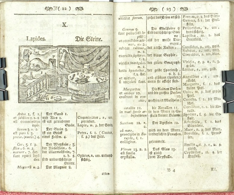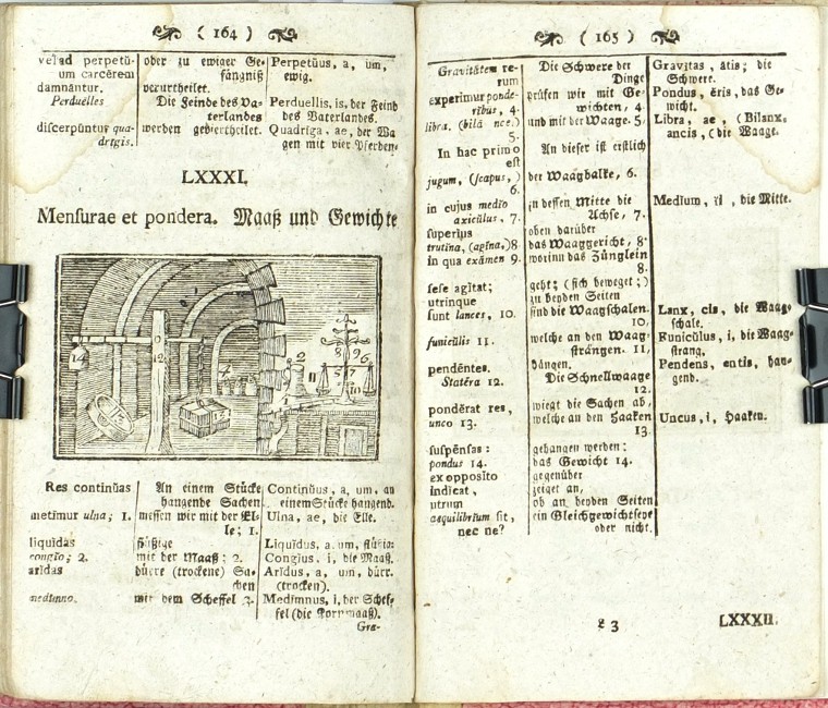 Comenius, John Amos. "Orbis Pictus. Die Welt in Bildern, in zwey und achtzig Abschnitte zum Gebrauche der kleinen studirenden Jugend ...". Vienna: Trattner, 1792. 8vo. 167 pp. with 82 woodcut illustrations in the text (cut by G. Sturm). Printing in three columns (Latin, German and Latin and German verbs and nouns in the first person singular, resp. nominative). Early 20th century half-parchment binding.