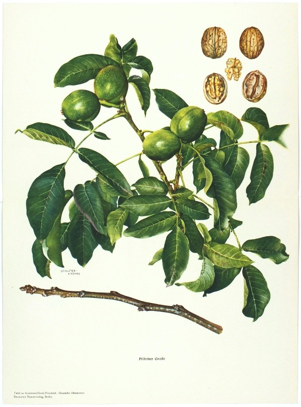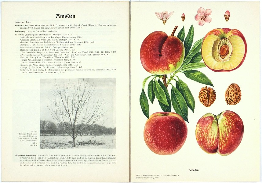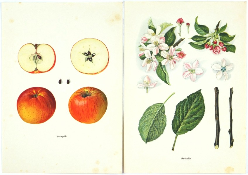 Contains a total of 217 color plates, 8 black-and-white plates, and approximately 650 pages of accompanying text. Detailed descriptions of various varieties of pome and stone fruit (apples, pears, cherries, plums, peaches, apricots, and nuts). - Covers with only minor flaws (spots, etc.); the spine of the 9th volume repaired; inside clean and in well preserved, complete.