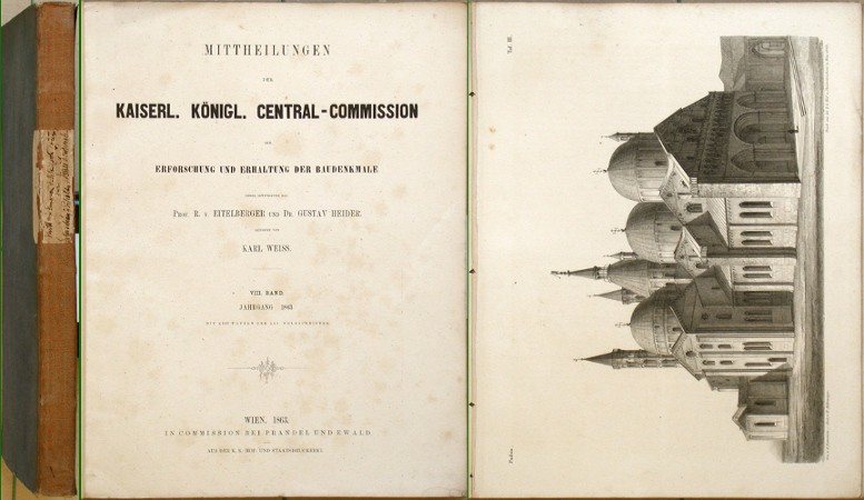 Architecture, Monuments.Eitelberger, R. v., Prof.; Heider, Gustav, Dr.; Weiss, Karl (Redacteur). "Mittheilungen der Kaiserl. Königl. Central-Commission zur Erforschung und Erhaltung der Baudenkmale". VIII. Band. Jahrgang 1863. Wien: In Commission bei Prandel und Ewald, 1863. 4to. (2), IV, 366 S. mit 202 Textholzschnitten, XIII Tafeln. OPp. mit Leinenrücken mit handschr. Titelrückenschild.