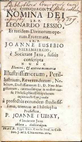 Lessius, Leonardus (1554-1623); Nieremberg, Juan Eusebio (1595-1658); Dubský, Johannes (1649-1700). "Quinquaginta nomin Dei a ... Et totidem Divinorum operum Erotemata a Joan. Euseb. Nierembergio ... conscripta .. nunc Honori ... Neo-Magistrorum ... a Joan. Dubsky ... oblata, deditacaque". Prag: Universität Carolo Ferd., 1684. 16°. (20), 170, (6) S. Prgt. a. d. Zeit.