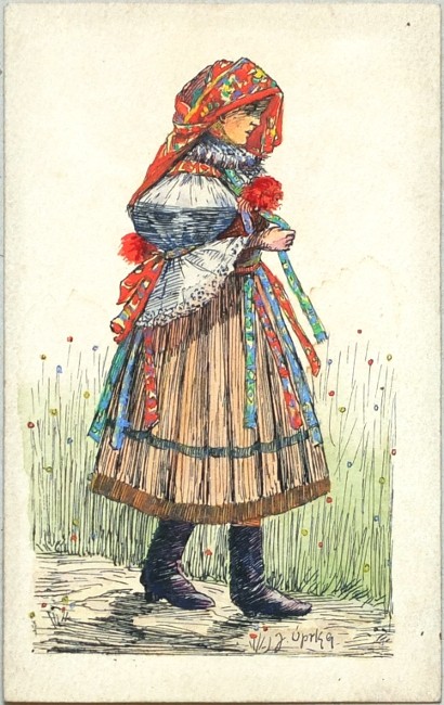 Uprka, Joža. "Slovácké děvče v kroji". Pův. kol. kresba tuší, J. Uprka (též Úprka), 1900-1910. Sign. tuší "J. Úprka" vpravo dole. Použito jako dopis s Uprkovým rukopisem na rubu. 10,1:6,3 cm na papíře o rozměrech 11,8:7,4 cm. Spolu s původní frankovanou obálkou, na zadní straně obálky razítko starého knihkupectví a antikvariátu.