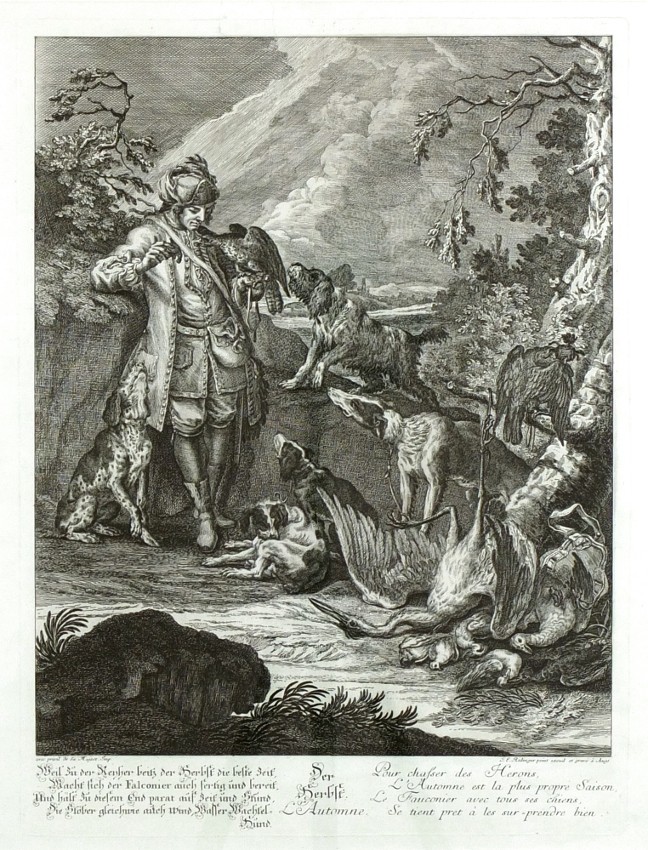 Ridinger, Johann Elias (1698-1767). The four seasons of the dogs. "Der Herbst. L'Automne". Orig. etching with copperplate engraving from Ridinger's "Die vier Jahreszeiten der Hunde" series (of 4 leaves). Augsburg, 1740. With engraved Ger.-Fr. title and verse text under the picture. 41,5:33 cm (16 1/4 x 13 inch.; the picture).