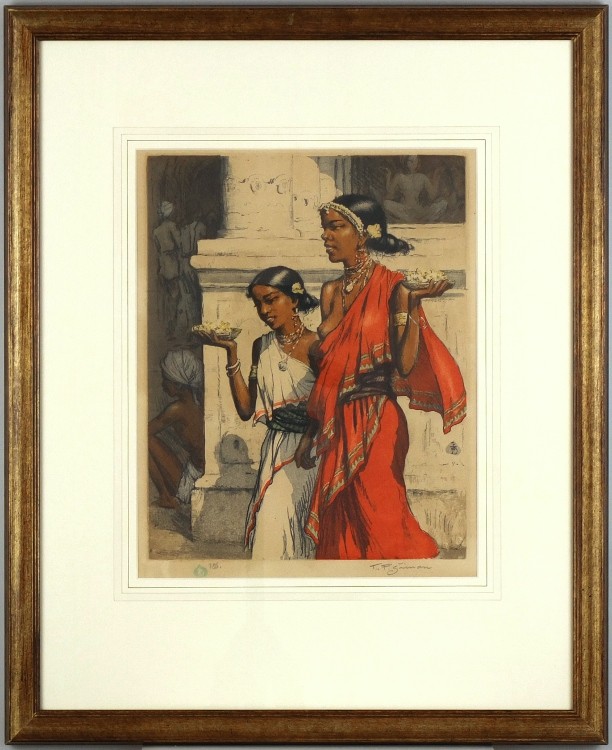 Šimon, Tavík František (1877-1942). "Indické dívky, Ceylon". Původní barevný lept, 1931. Výtisk čís. 186/(200). Tužkou signováno a číslováno pod deskou, značkou ('TFŠ') tamtéž a ještě v desce vpravo dole. 28,7:22,5 cm.