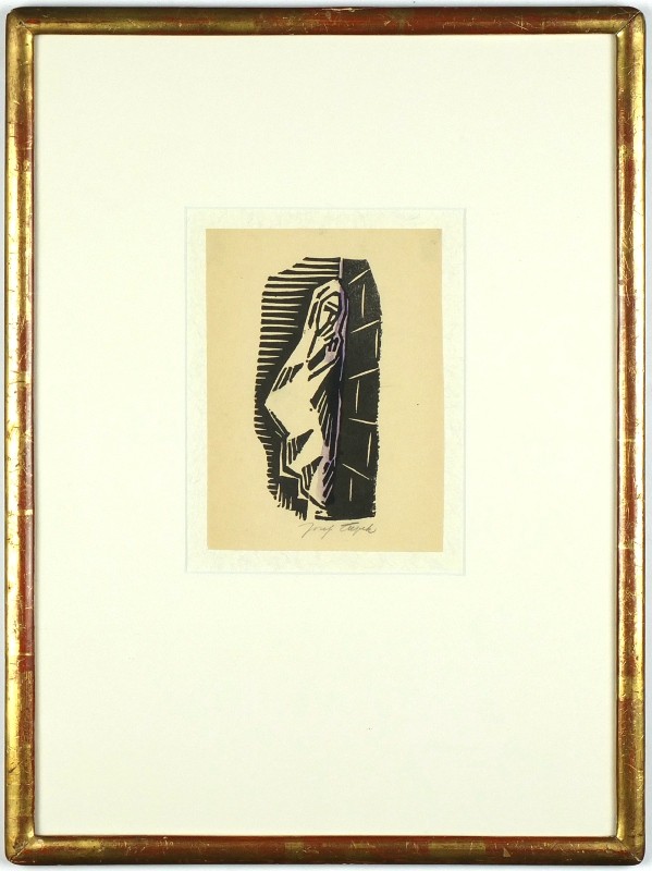 Čapek, Josef (1887-1945). "Žebračka". Původní kolorovaný linoryt z: 'Osmero Linoleí', Stará Říše, M. Florianová, 1919. Tužkou signováno vpravo pod deskou. 14:6,7 cm na papíře o rozměrech 17:12,5 cm.