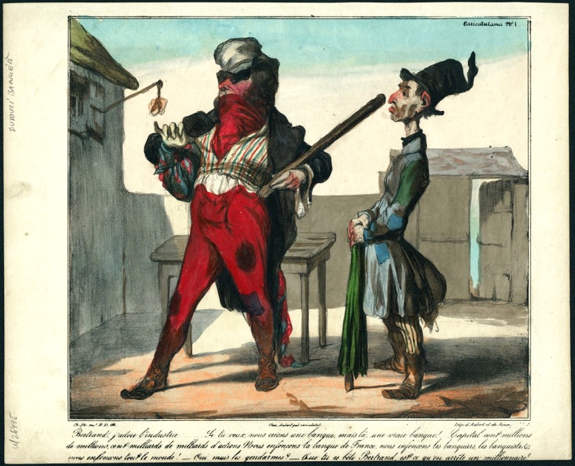Daumier, Honoré (1808-1879). Future banker (Robert Macaire). "Bertrand, j’adore l’industrie …". Orig. lithograph, 1838. Plate nr. 1 from 'Caricaturana' Series. Orig. old colouring. With 3 lines of French text under the picture. 23:26 cm (9 x 10 1/4 inch.). Printed on paper sized 27:31,5 cm.