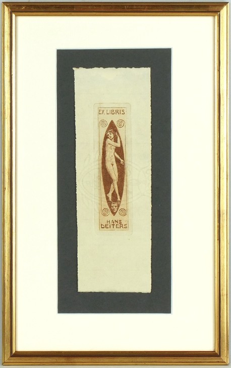 Deitres, Hans. "Ex Libris Hans Deitres" (own bookplate). Orig. etching, ca. 1900. 12:3 cm on handmade paper measuring 22.5:7.5 cm with a distinct watermark.