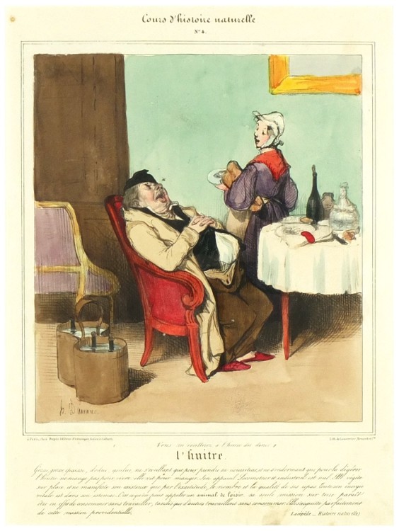 Daumier, Honoré. Satirical picture. "Cours d'histoire Naturelle. No. 4. ... l'huitre" (the oyster). Orig. lithograph, Paris, Dupin, 1837. Printed by Lemercier. Orig. old colouring. With the title of the series above the image and the title and 6 lines of French text below it. Lithographically signed in the plate at the bottom left. 21,5:19 cm (8 1/2 x 7 1/2 inch.; the picture).