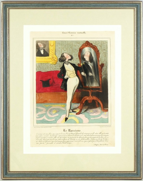 Daumier, Honoré. Satirical picture. "Cours d'histoire Naturelle. No. 7. Le Narcisse". Orig. lithograph, Paris, Dupin, 1837. Printed by Lemercier. Orig. old colouring. With the title of the series above the image and the title and 6 lines of French text below it. Lithographically signed in the plate at the bottom left. 21,5:19 cm (8 1/2 x 7 1/2 inch.; the picture).