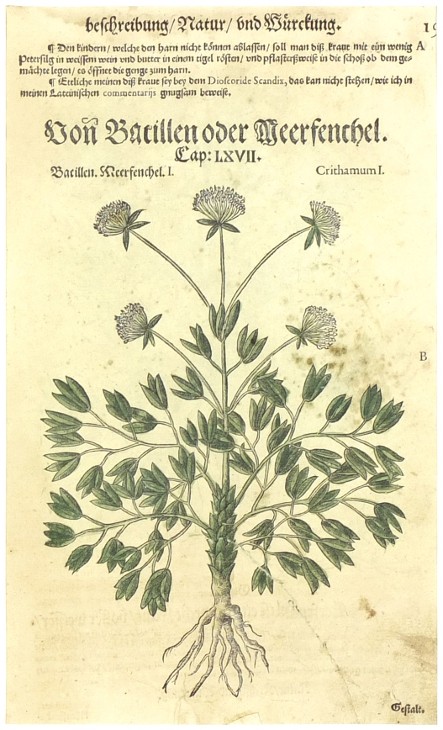 Motar přímořský. "Bacillen. Meerfenchel. Crithamum". Původní, staře kolorovaný dřevořez z prvního německého vydání P. A. Mattioliho herbáře ('New Kreüterbuch'). Vyd. Melantrich z Aventina v Praze, 1563. S německo-latinským titulem a textem nad obrázkem. 30:18 cm (výřez pasparty).