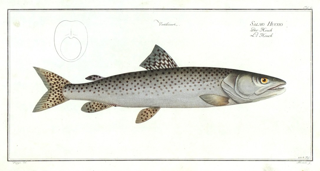Huchen (Danube salmon). "Salmo Hucho. Der Heuch. Le Heuch". Orig. copperplate engraving, M. E. Bloch, 1784. Orig. old colouring. Engraved by Bodenehr after Krüger. 18,5:37 cm (7 1/4 x 14 1/2 inch).