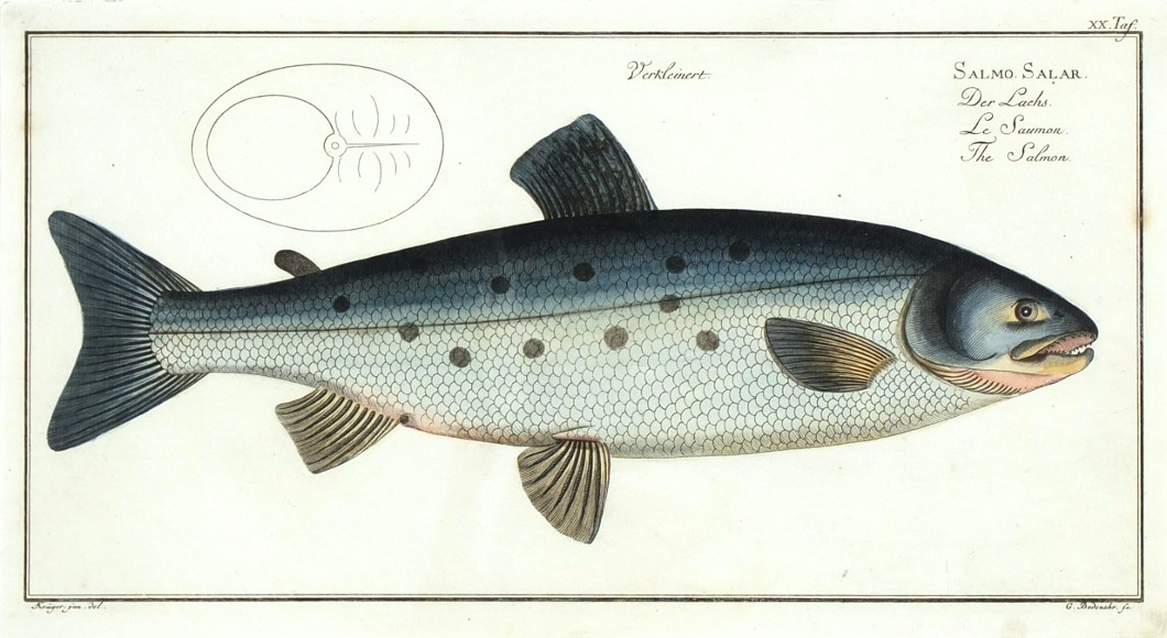 Atlantic salmon. "Salmo Salar. Der Lachs. Le Saumon. The Salmon". Orig. copperplate engraving, M. E. Bloch, 1784. Orig. old colouring. Engraved by Bodenehr after Krüger. 20:38,5 cm (7 3/4 x 15 1/4 inch).