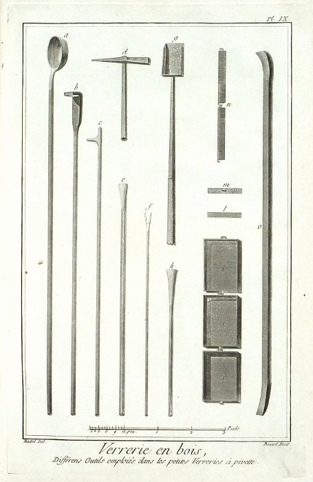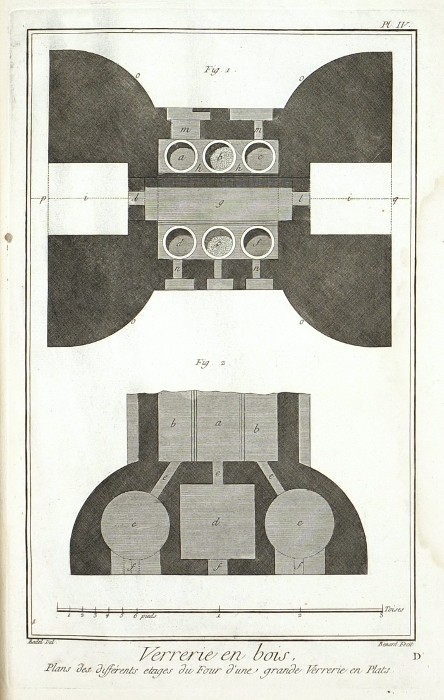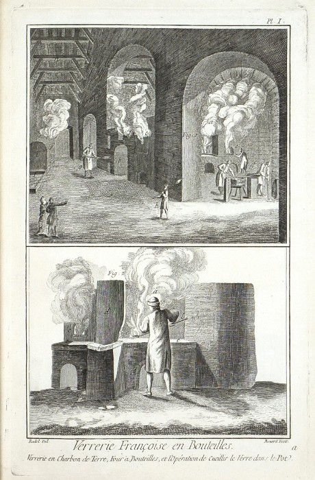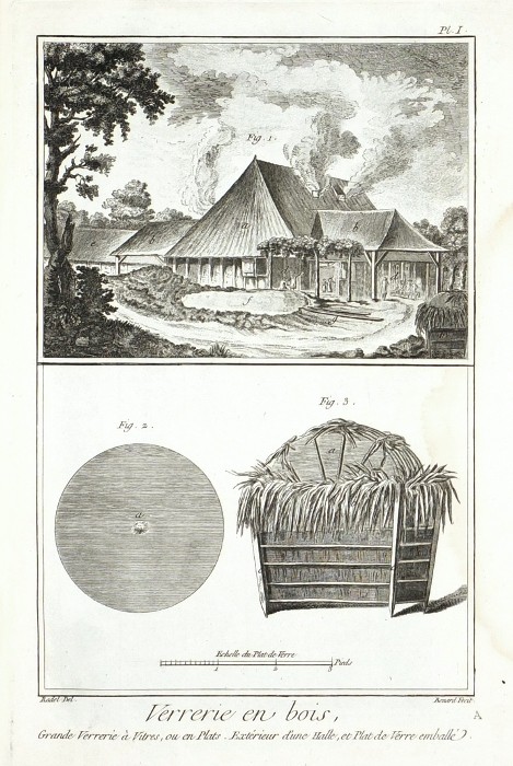 Diderot, d’Alembert. Encyclopédie. Glassmaking. "Verrerie en bois ... premiere section ... seconde section ... Verrerie en bouteilles ... françoise ... angloise´. Paris: Briasson and Le Breton, 1772. Complete section from the ‘Encyclopédie, ou dictionnaire raisonné des sciences, des arts et des métiers’ with a total of 54 copperplate engravings (15 of which are folded, each approx. 32:42 cm, and 39 full-page plates, each approx. 31:20 cm - all engraved by J. R. Benard after drawings by L. F. Radel) and 9 pages of text.