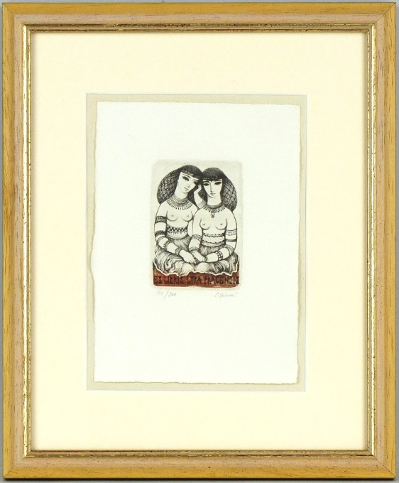Jiřincová, Ludmila. "Dvě babylónské dívky - Ex Libris Lyra Pragensis". Původní barevný lept, 1977. Signováno a číslováno (171/200) tužkou pod deskou. 6,7:4,8 cm na ručním papíře o rozměrech 14,7:10,8 cm.