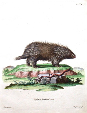 Porcupine. "Hystrix dorsata Linn.". Orig. etching by J. Nussbiegel after DeSeve. Original old colouring. From: J. D. von Schreber, Die Säugthiere in Abbildungen. Published by Walther in Erlangen, ca. 1780. 23:18 cm (9 x 7 inch.).
