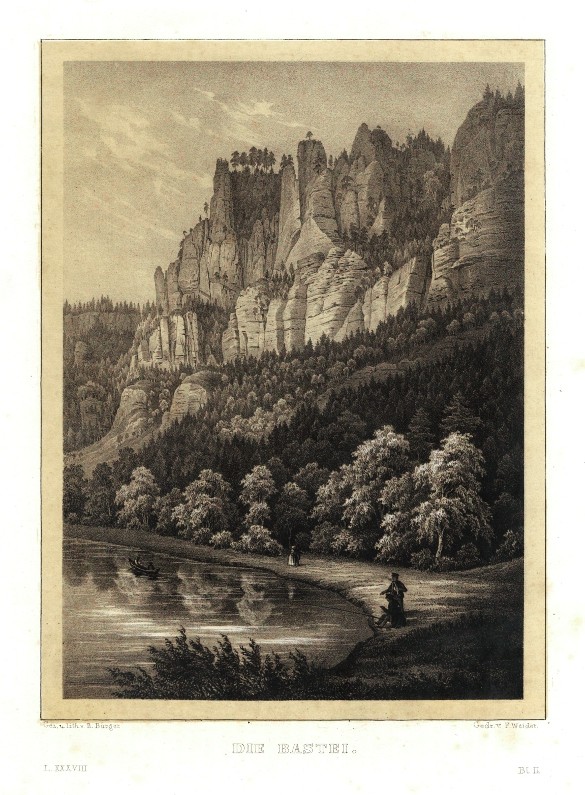 Sächsische Schweiz. "Die Bastei". Orig. Lithographie von R. Bürger. Aus: C. G. Semmler - 'Der Elbstrom, von seinem Ursprunge bis zu seiner Mündung in die Nordsee ...'. Dresden: Semmler, 1845. Mit Figuren vorne. 23:17 cm.