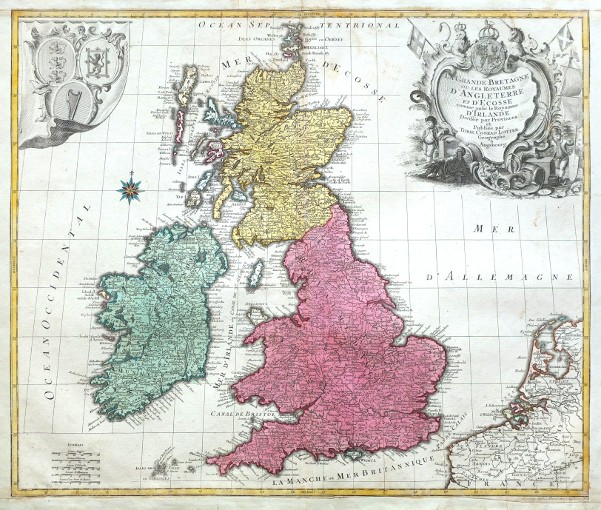 Great Britain and Ireland. "La Grande Bretagne ou les Royaumes d'Angleterre et d'Ecosse comme aussi le Royaume d'Irlande Divisee par Provinces". Altkol. Kupf.-Kte. bei T. C. Lotter (1717-1777), Augsburg, 1764. Gest. von M. A. Lotter. Mit gr. fig. Titelkart. mit Wappen und andere Kart mit 3 Wappen. 48,5:58 cm (19 x 22 3/4 inch.).
