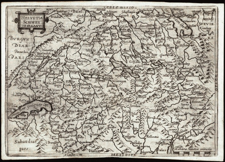 Switzerland. "Helvetia Schweytzerlant". Orig. copper-engraving, G. Botero. Publ. in Cologne, 1596. With ornamental title-cartouche and the scale of map ("Milliaria Helvetica communia"). 19,5:27 cm (7 3/4 x 10 3/4 inch.).
