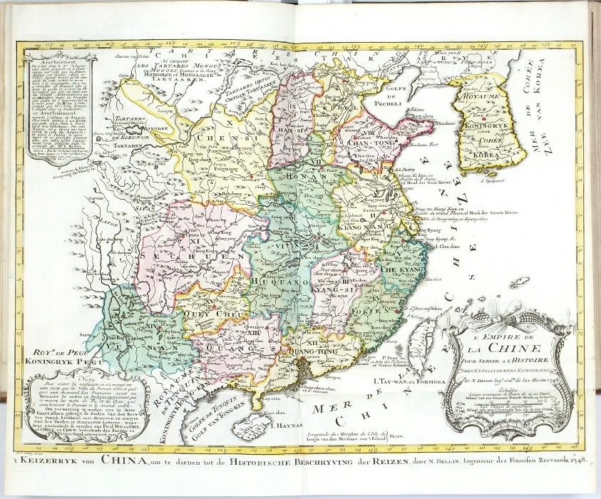 Includes maps (among others): The World in Two Hemispheres ('Mappe Monde ou Descriptio du Globe Terrestre'), The Canary Islands ('Carte des Isles Canaries'), China ('l'Empire de la Chine'), Japan ('Carte des Isles du Japon'), The Philippines ('Carte des Philippines Celebes et Moluques'), The Gulf of Mexico and Florida ('Carte du Golphe du Mexique et des Islaes de l'Amerique'), Brazil ('Carte du Bresil'), Louisiana ('Carte de la Louisiane et Pays Voisins'), the Great Lakes ('Carte des Lacs du Canada'), the East Coast of the USA ('Carte de la Nouvelle Angleterre, Nouvelle York et Pennsylvania'), North and South Carolina and Georgia ('Carte de la Caroline et Georgie'). - Very well preserved, maps printed on thick paper.